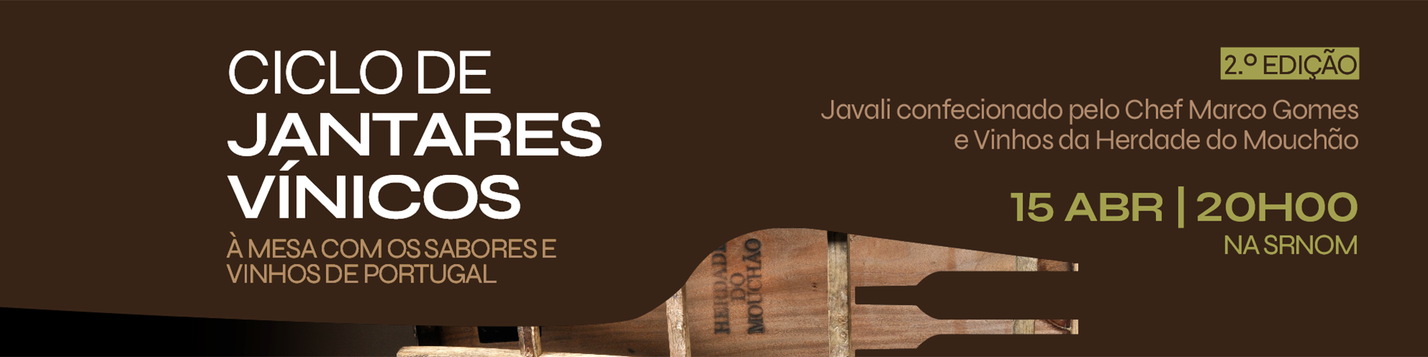 O segundo jantar, que será no dia 15 de abril, às 20:00, será dedicado ao Alentejo, tendo como destaque o javali estufado no pote, confecionado pelo Chef Marco Gomes, em harmonização com os vinhos da Herdade do Mouchão.
